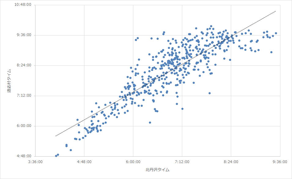 道志村とキタタンのタイムの相関関係