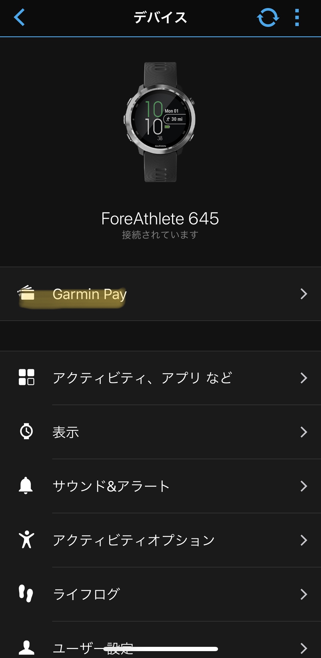 まず、マイデイ画面の上部にあるウォッチの写真から「デバイス」画面を表示し、「Garmin Pay」を選択します。
