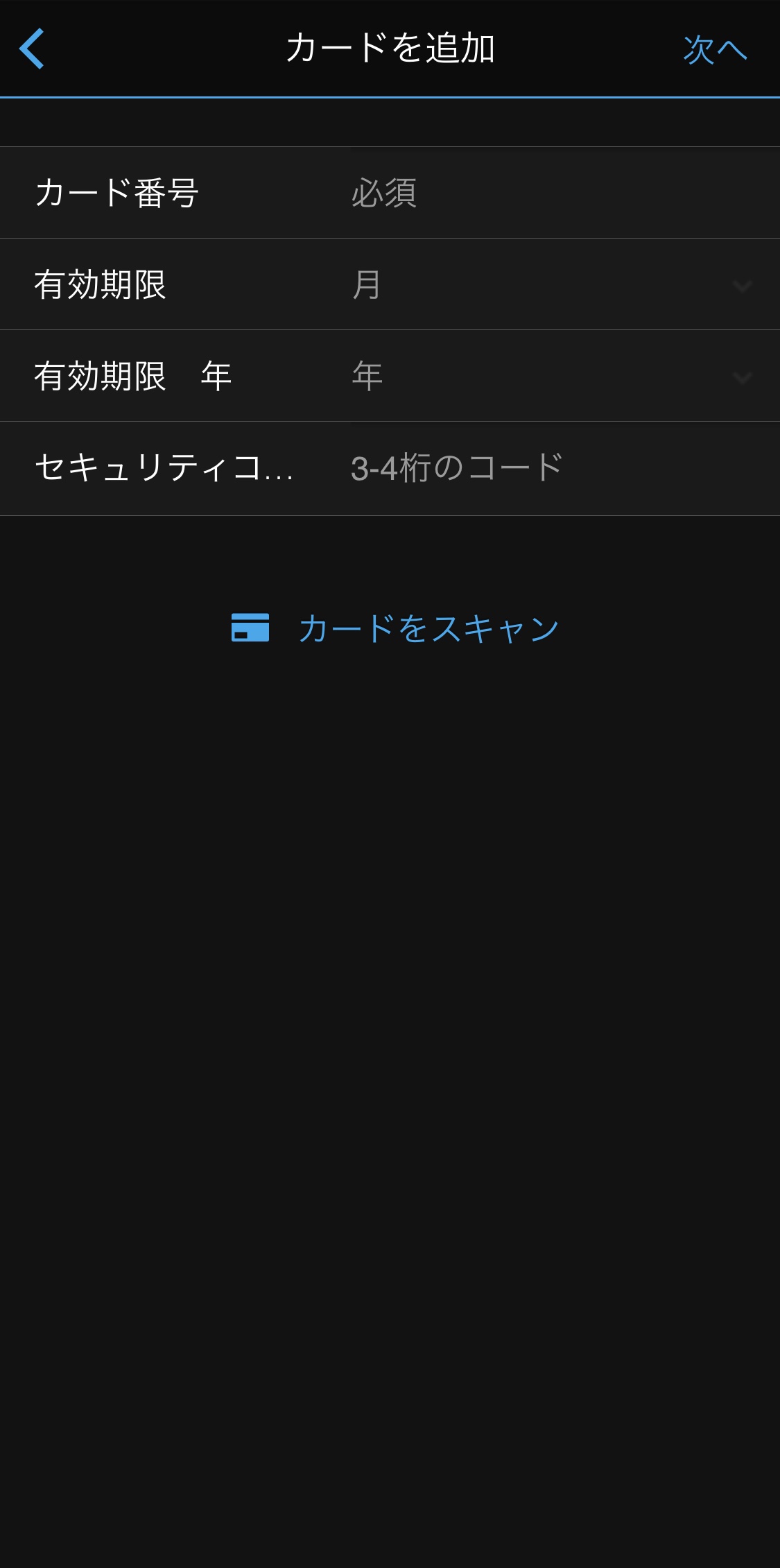 カードの追加画面でカード情報を入力します。「カードをスキャン」からカメラで読み取ることも可能です。