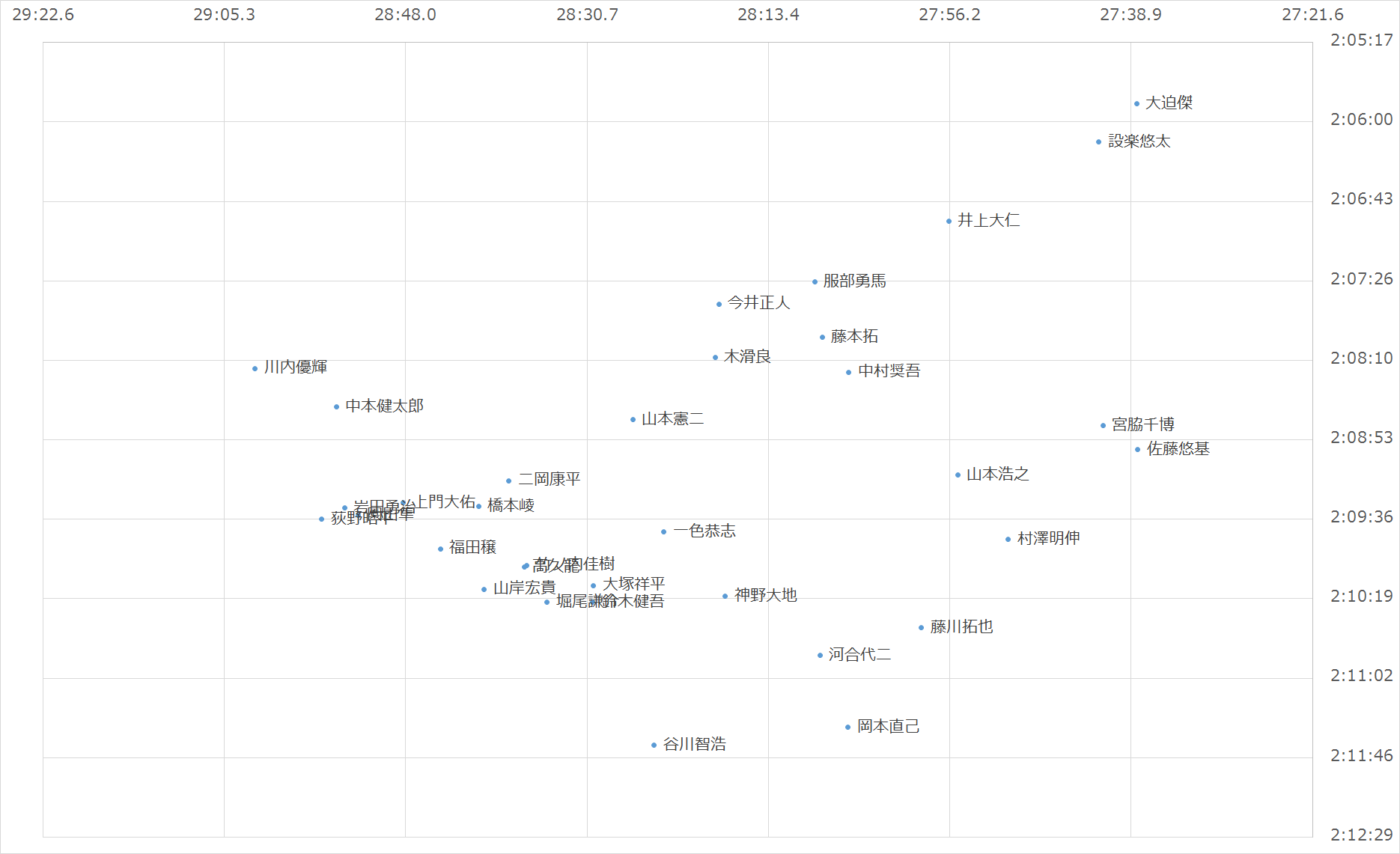 | 19 | 大迫傑 | 2:05:50 | 27:38.3 | 4.55 |