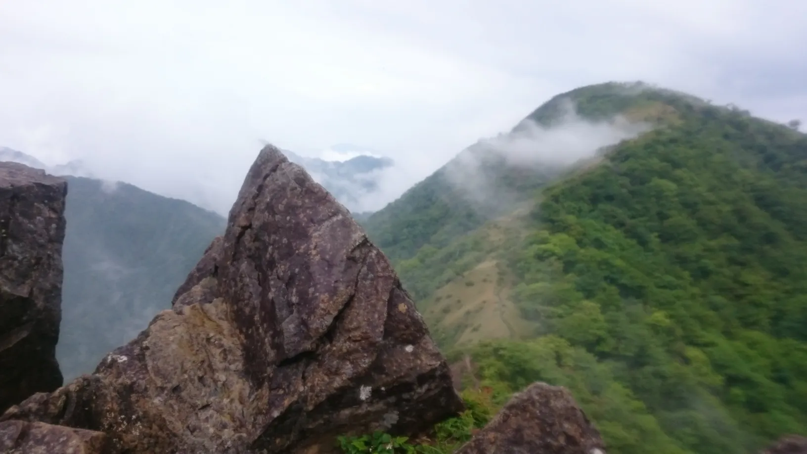 丹沢山の標高は1567m。塔ノ岳とは70m程度の差ですが、一旦100m程下ってから、また170m程登る形となります。登りの区間に入ると見晴らしが良くなり、天気が良ければきれいな新緑を楽しむことができたのだと思いますが、残念ながら雲ばかり。